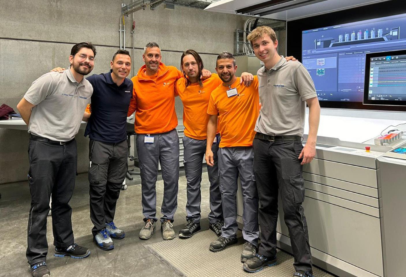 Algunos miembros de Grupo La Plana en plena formación con el equipo de HEIDELBERG en el Print Media Center de Wiesloch, Alemania.