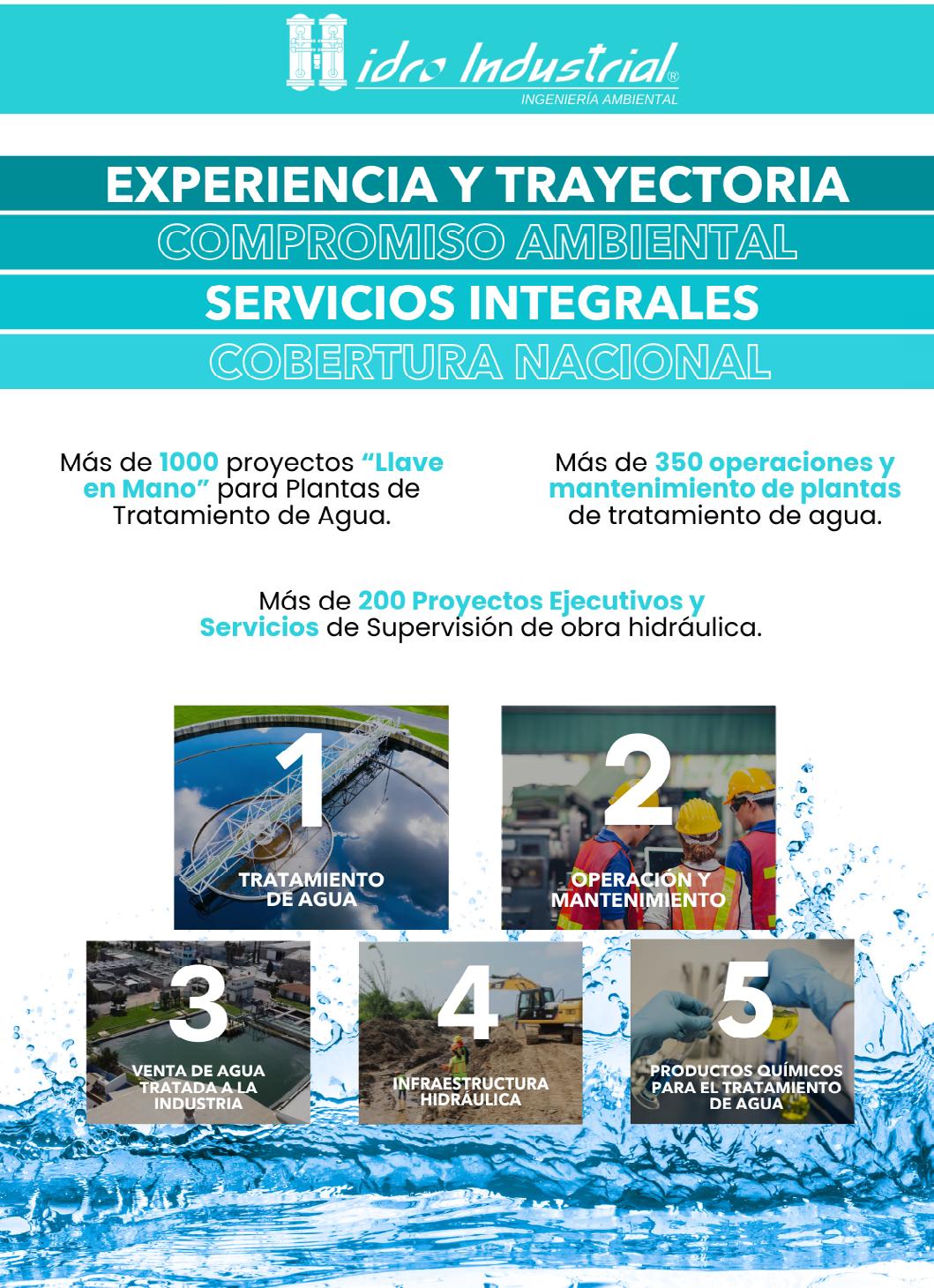 PTARI (Plantas de Tratamiento de Aguas Residuales Industriales),PTAPI (Plantas de tratamiento de agua potable industrial), ósmosis inversa industrial, sistemas de reúso de agua, sistemas de filtración especializados .