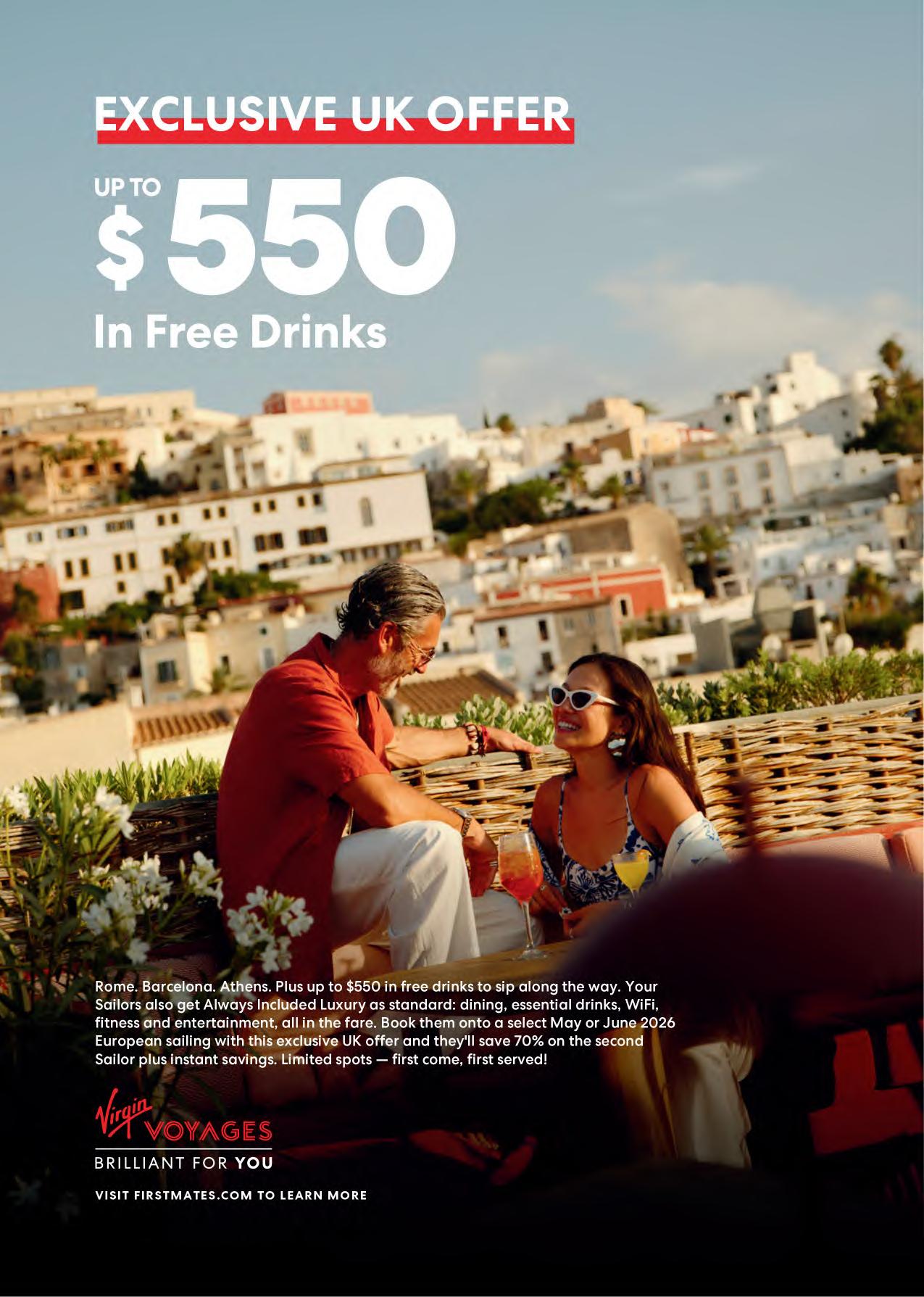 • UNTIL MAY 28th, Virgin Voyages’ First Mates will earn £10 per booking across select European sailings. The incentive applies to 12 Virgin Voyages cruises aboard Scarlet Lady and Valiant Lady departing in May and June 2026.