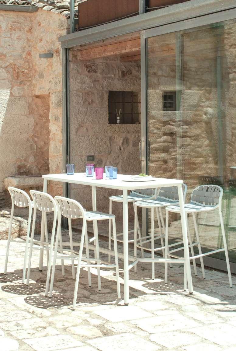 The Nef aluminium seat collection, inspired by the graphic design of hot air ballons, combines eclectic style and visual lightness with a solid structure. The interweaving of polyester ropes gives a natural feeling of comfort and ease to the dining armchair and lounge chair, available in two height options of backrest.