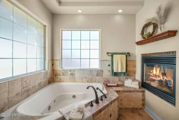 The owners suite has a pass through fireplace into the bathroom. 2 separate closets, and a separate entry to an exclusive patio, with bunco seating and wiring for a hot tub.