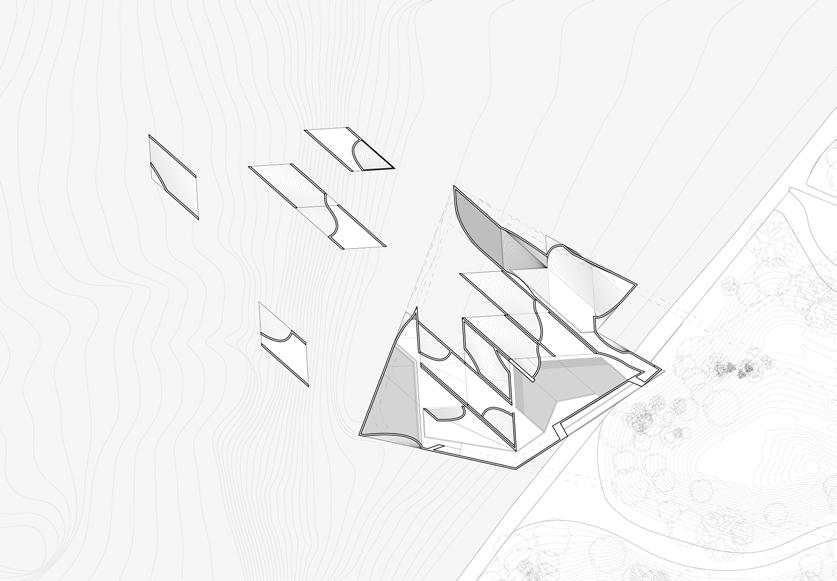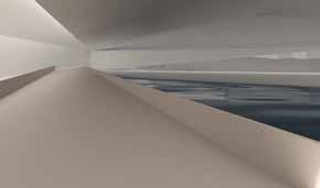 How do we capture the feeling when experience a space? What kind of feeling is it? Is it different from how we experience the wind, the ocean or human interaction? Based on the study of Tonino Griffero on “quasi-Thing” and atmospheric feeling, we focused our topic on pain and gaze and how their existence, presented by causing a direction or disturbance of attention of the subject of experience, is spatialized. We encountered the study of work of Anni Albers spade making in the phenomenon that the spade iterate itself forming a larger field where the edges of the spade, orienting in different directions, constantly direct and redirect the visual attention of the viewer, disturbing and re-constructing the movement of eyesight, forming a turbulent field composed of iterated units. The project’s overall plan strategy incorporates the trajectory of locations with ambiguous environmental condi tions, between water and land, between land and air. The trajectories are spatialized as a straight path of walking, cycling, and potentially water transportation, linking different loca tions. When approaching these points with ambiguous environmental conditions, they form a knot that allows more transformative experience between environmental conditions within a constructed palpitating environment and cellular conditioned rooms. These cellular con ditions also exist in the form of aggregatable units that could drift out, depart, intersect and diffuse from the knot. The ship and building condition of the amphibious part and the knot creates a transformative condition both to the building geometry and the individual experi ence of horizon, light and distance.