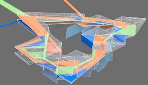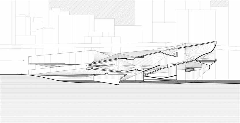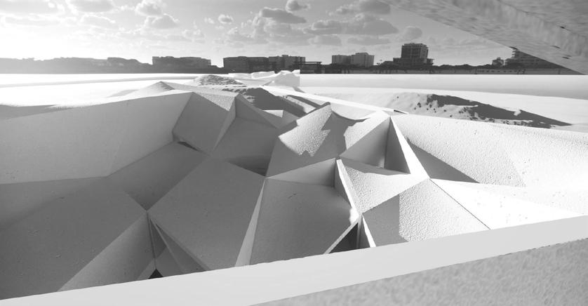 The east knot emphasizes on the spatialization of the trajectories within a knot as a straight path of walking, cycling, and potentially water transportation, allowing a more transformative experience between environmental conditions within a constructed palpitating environment and cellular conditioned rooms, creating a transformative condition both to the building ge ometry and the individual experience of horizon, light and distance.