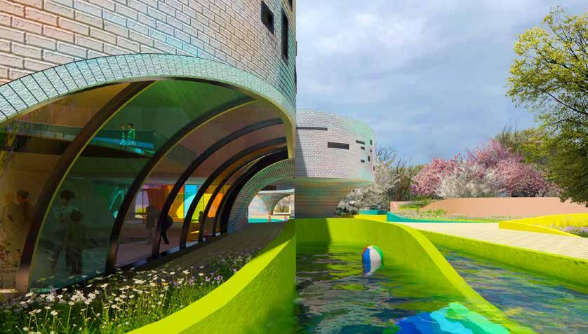 Passing through the more compressed vaulted zones within the iridescent brick façade, and expansive secret garden is revealed winthin each of the courtyard, while water weaves in shallow channels throughout the site and connects multiple water playscapes and the river.