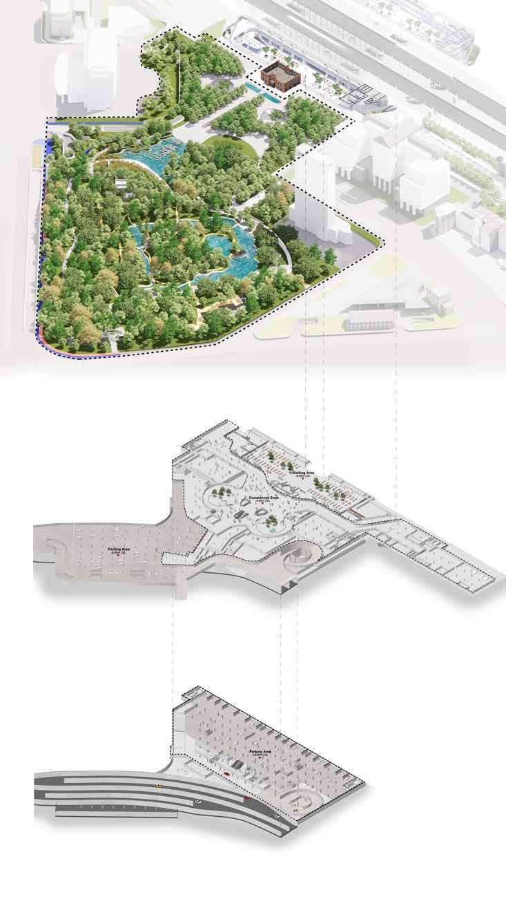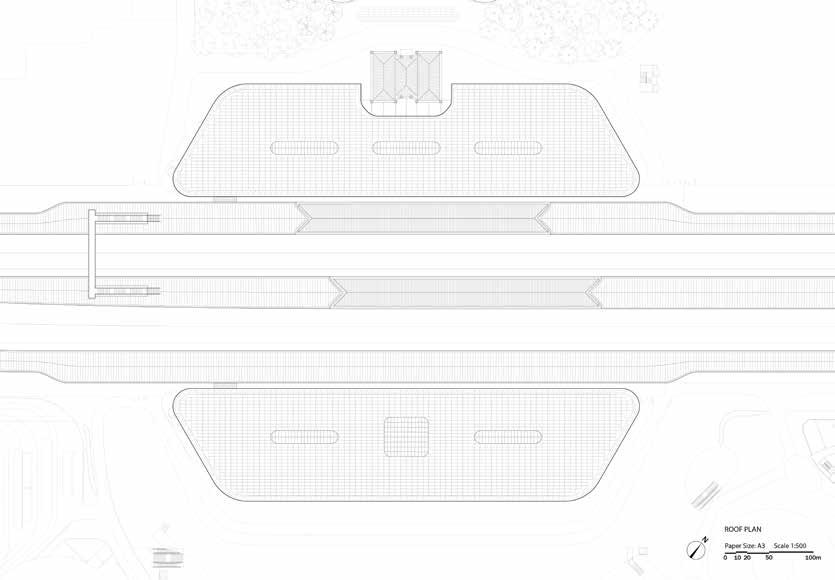 The train station is situated in the center of Jiaxing, an interconnected city in southeast China close to Shanghai, Hangzhou, and Suzhou. In 1921, the First Party Congress of the Communist Party of China was held in Jiaxing, which led to the founding of the Party. The project brief covers an area of 35.4 hectares, encompassing Jiaxing Train Station, the pla zas to the north and south, and a renovation of the adjacent People’s Park. Drawing inspi ration from Jiaxing’s historic and cultural contexts, MAD’s proposal includes a 1:1 rebuild ing of the historic station building derived from archival studies, while creating a new train station underground. The new station will be bright, efficient, and human-scaled, with a flood of natural light to create a friendly, comfortable environment. The main transportation and commercial functions are to be located in the basement level, allowing the groundfloor space to be given back to nature. A shared space between Jiaxing’s citizens and travelers, this new green urban center will transform into a “train station in the forest.”