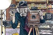 Im Zentrum des Blockes steht Olle selbst an einer Tailboard-Reisekamera aus dem frühen 20. Jh. Links von ihm ist eine Kalart Busch Pressman aus 1948, rechts eine Szabad-Kamera, eine schwedische Großformatkamera.