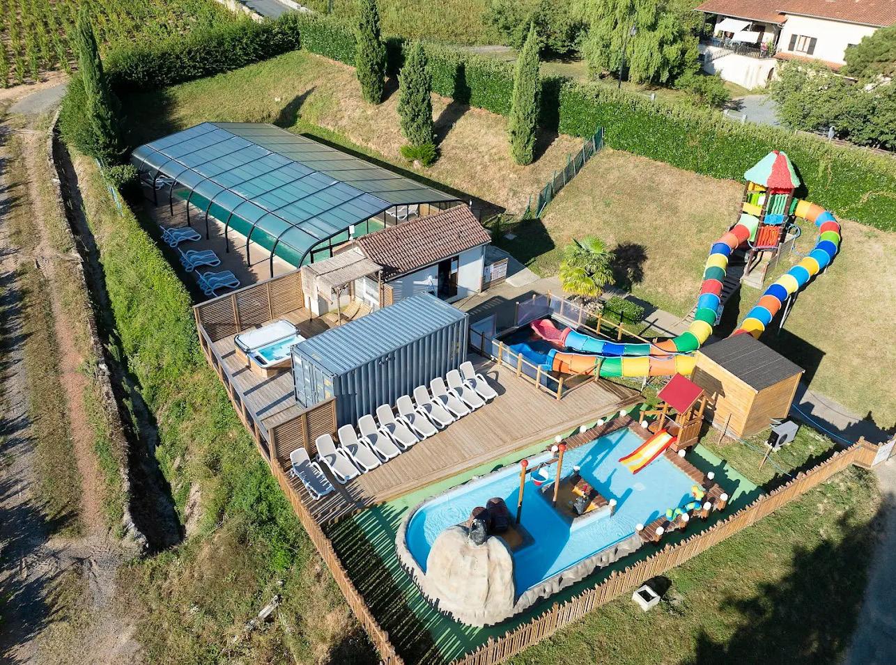 Four sanitary blocks with showers, private washing cubicles and facilities for babies and accessible facilities. Washing machines and dryers. Well-stocked shop. Bar with TV. Restaurant and takeaway. Waterpark with heated outdoor pools, indoor pool and slides. Aquagym. Spa. Sports and kid's club (seasonal). Tennis. Volleyball. Table tennis. Boules. Multisports field. Playground. Entertainment programme. Cycling, rafting, horse riding and canoeing are nearby. WiFi (extra charge).
