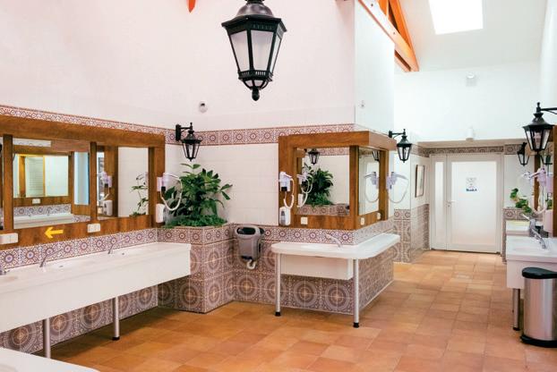 Toilet blocks Typically, toilet blocks will be equipped with WCs, washbasins with hot and cold water and hot shower cubicles. They will have all the necessary shelves, hooks, plugs and mirrors. There will be a chemical toilet disposal point, and the campsite will provide water and waste-water drainage points and bin areas.