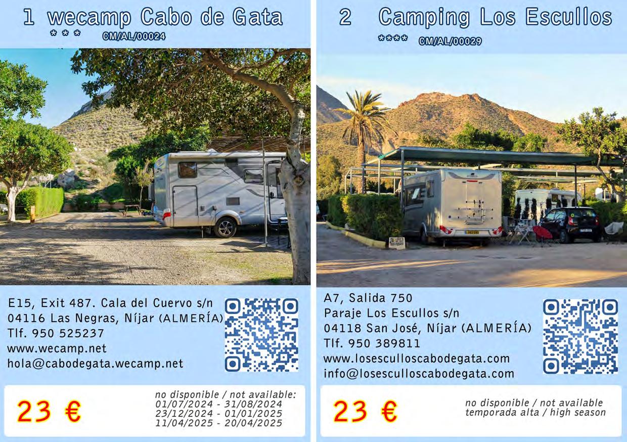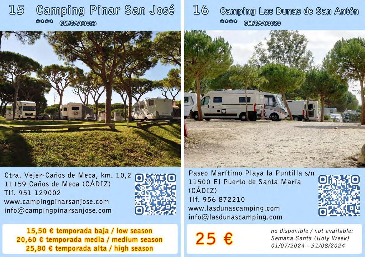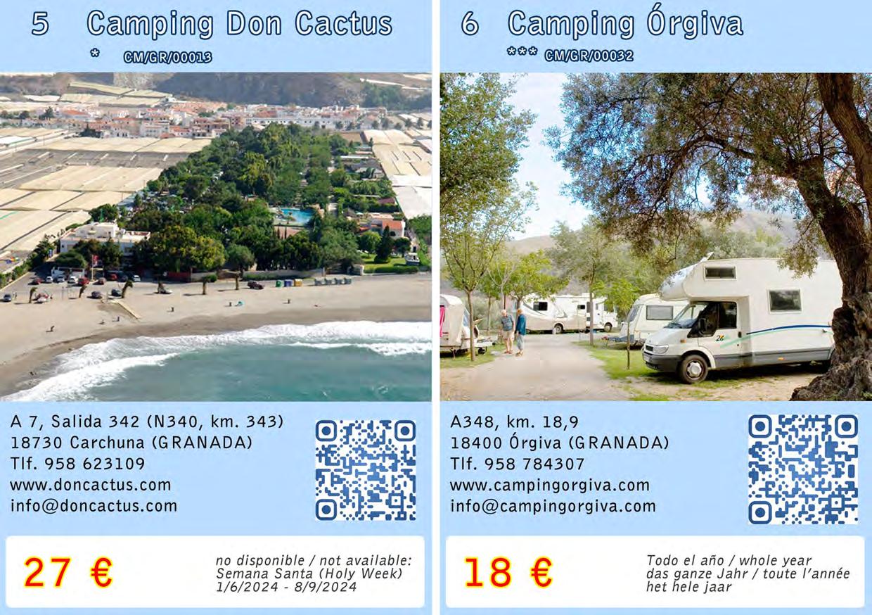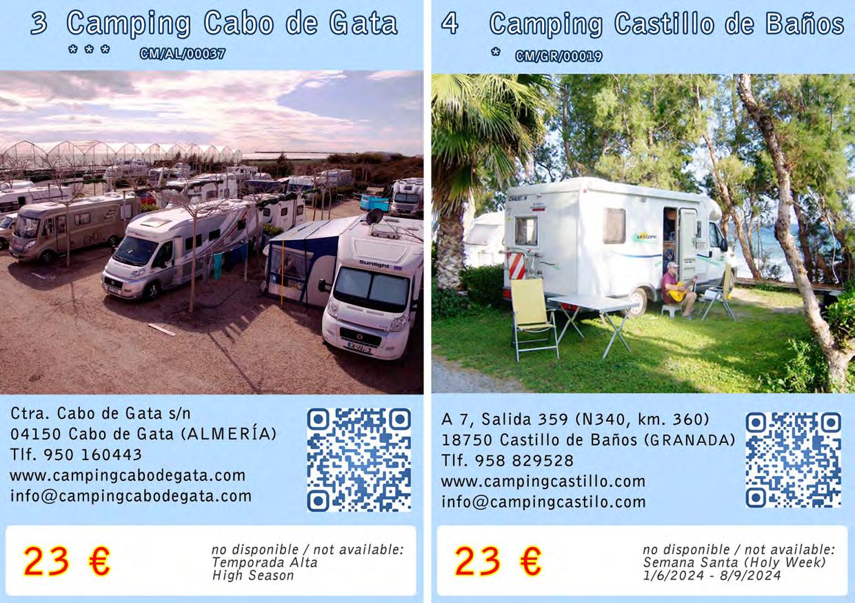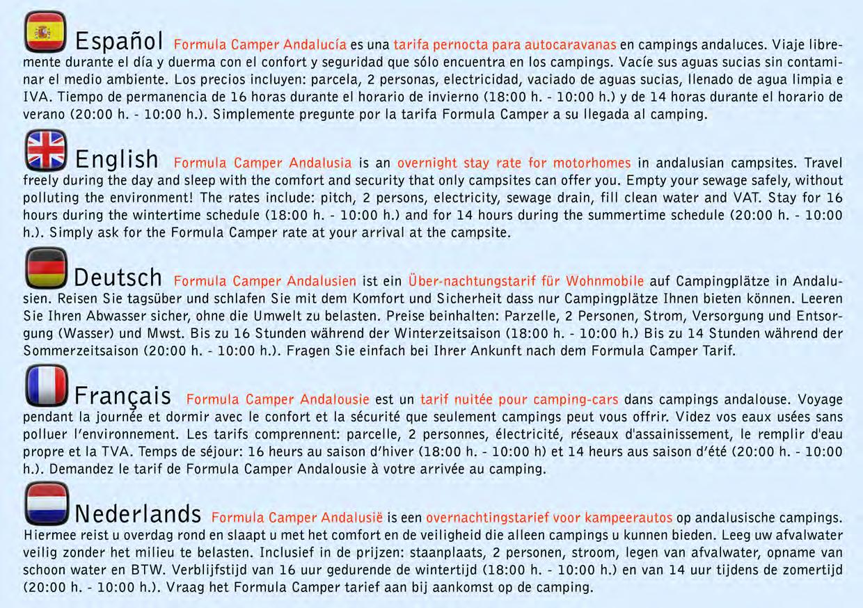 Formula Camper Andalusia is an overnight stay rate for motorhomes in Andalusian campsites. Travel freely during the day and sleep with the comfort and security that only campsites can offer you. Empty your sewage safely, without polluting the environment! The rates include: pitch, 2 persons, electricity, sewage drain, fill clean water and VAT. Stay for 16 hours during the wintertime schedule (18:00 h. - 10:00 h.) and for 14 hours during the summertime schedule (20:00 h. - 10:00 h.). Simply ask for the Formula Camper rate at your arrival at the campsite.