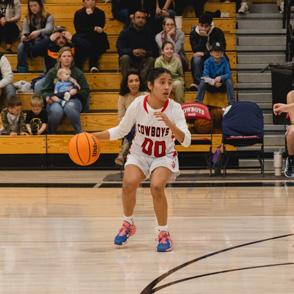 Hunter Vincent sprints along the baseline in the Cowboys narrow loss to North Fork earlier this month. (Photos by Mariel Wiley) Basketball B6
