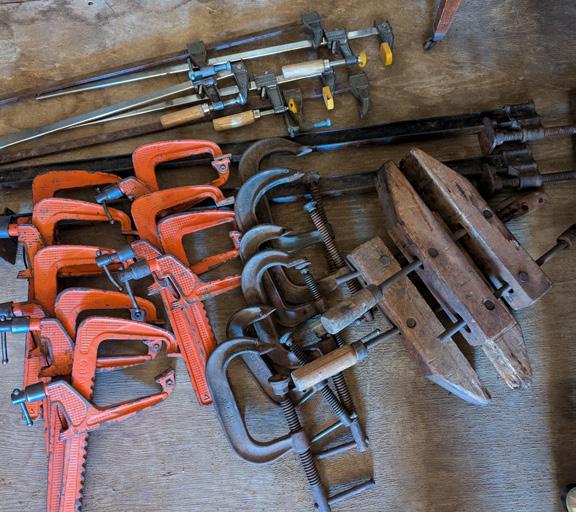 CLAMPS OF ALL SIZES AND TYPES: Eight fabricating Carver Brand (very expensive $$) extendable clamps, five clampsmiscellaneous, large and small bar clamps, two 12” wood hand screw clamps. All $500 for the complete set. Call 970-9013114.