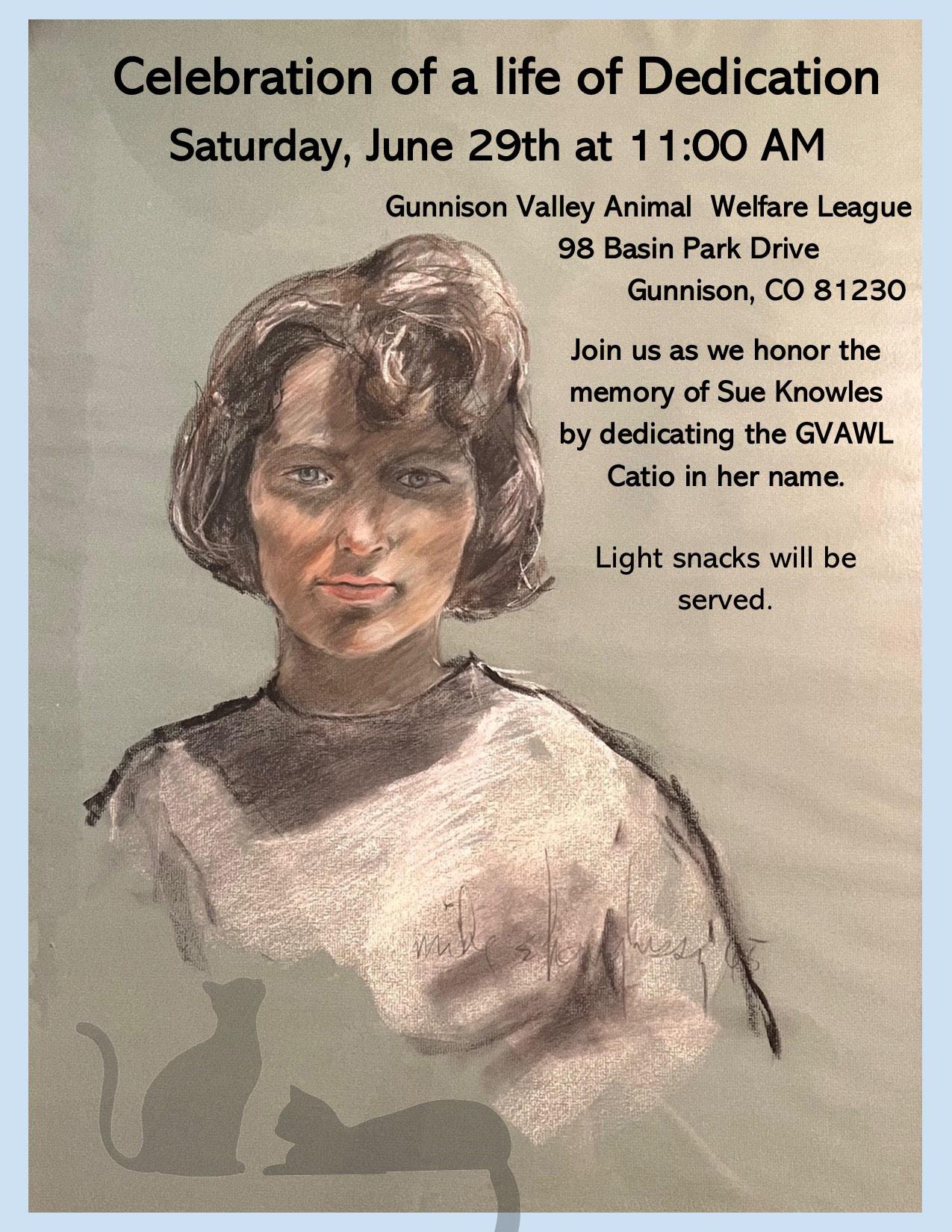 GVAWL DEDICATION: The Gunnison Valley Animal Welfare League will honor the memory of longtime volunteer Sue Knowles with a catio dedication celebration on June 29 at 11 a.m. in the shelter at 98 Basin Park Drive. Light snacks will be served. For more information or to arrange to give a brief speech, call 970.641.1173.