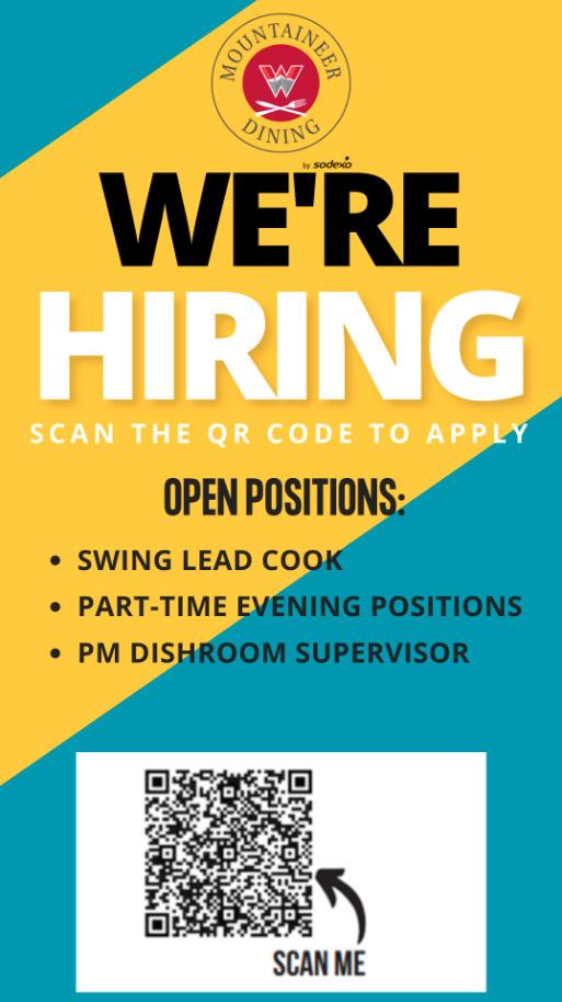 COME JOIN THE MOUNTAINEER DINING TEAM: Competitive pay, full benefits and holidays off.
