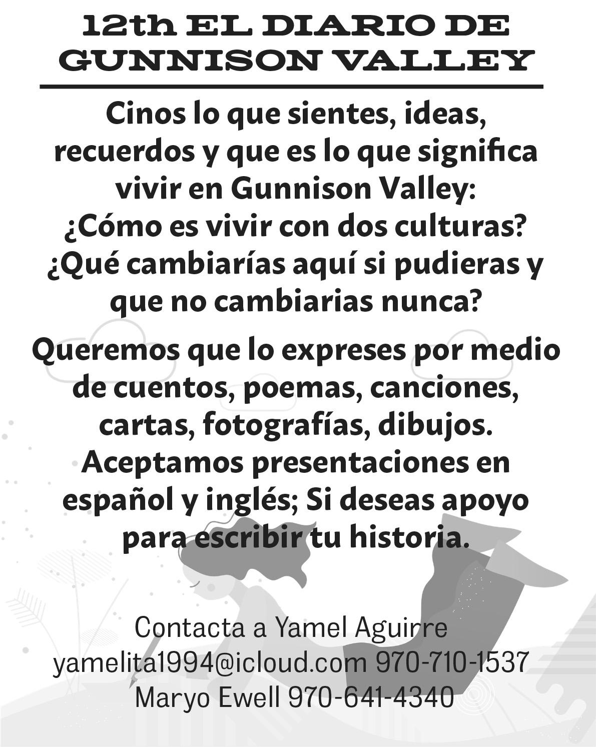 SEEKING SHORT PLAY SUBMISSIONS: The Gunnison Valley Theatre Festival is seeking new 5-10 minute plays for its first annual play crawl on August 10. The deadline for submissions is August 1. Plays will be performed at venues around Gunnison. Visit westerntheatrecompany. squarespace.com/gunnisonvalley-theatre-festival for submission guidelines and more information.