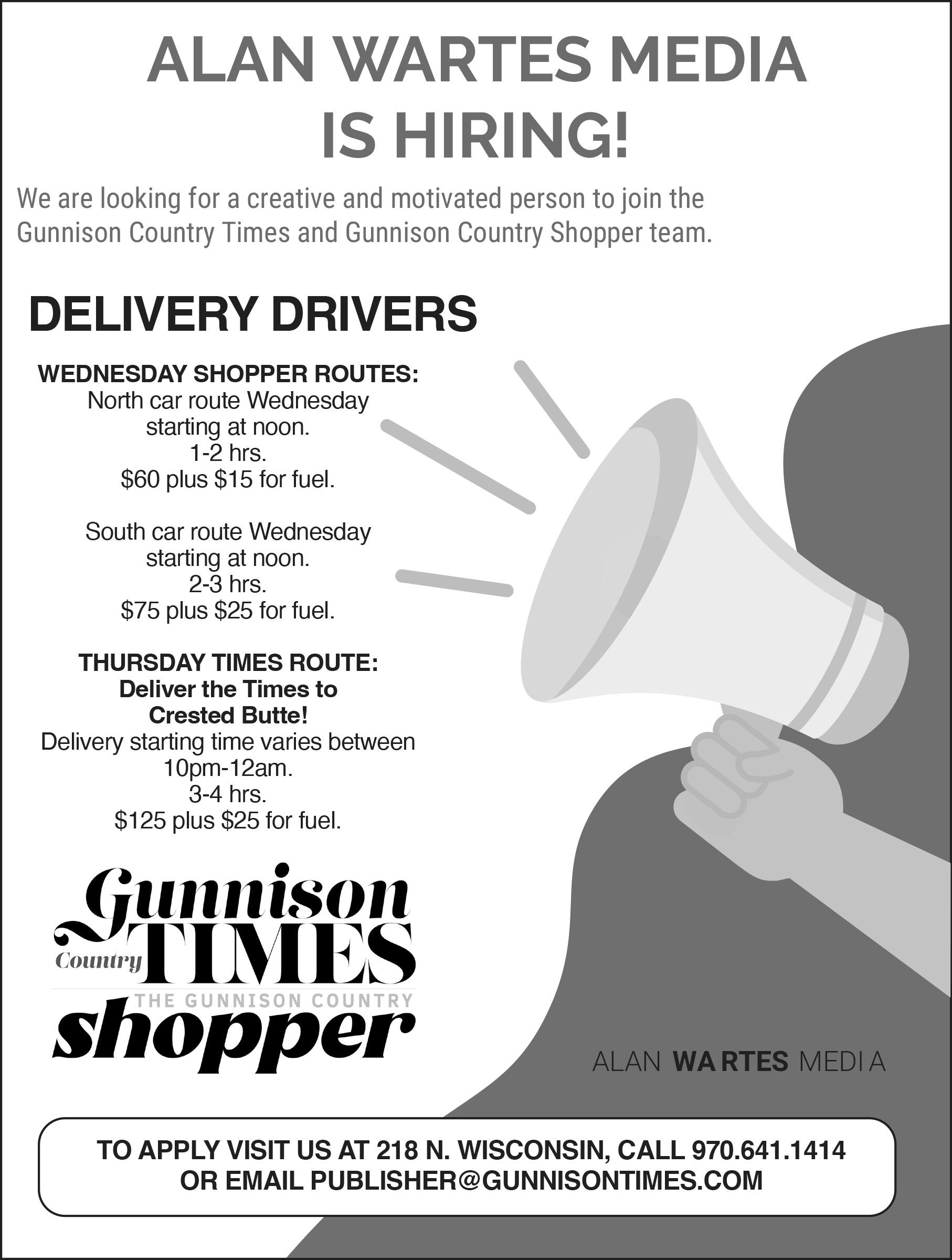 To apply please email publisher@gunnisontimes.com call 970-641-1414 or come in the office at 218 N. Wisconsin St.