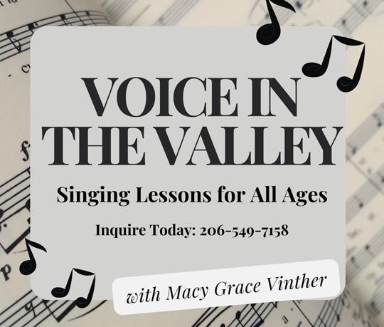 VOICE IN THE VALLEY! Are you or someone you know interested in taking singing lessons? Contact Macy Grace Vinther to inquire about a trial lesson today! Take your vocal technique and musicianship to the next level in a motivating and encouraging environment! All ages welcome. Email: macy.grace.music. movement@gmail.com.