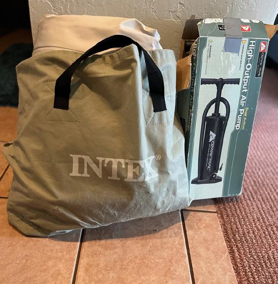 INFLATABLE QUEEN MATTRESS WITH AIR PUMP: Includes storage bag. Used twice, good for camping or RV. $25 OBO. nagruber1@gmail.com or text 970-275-5064.