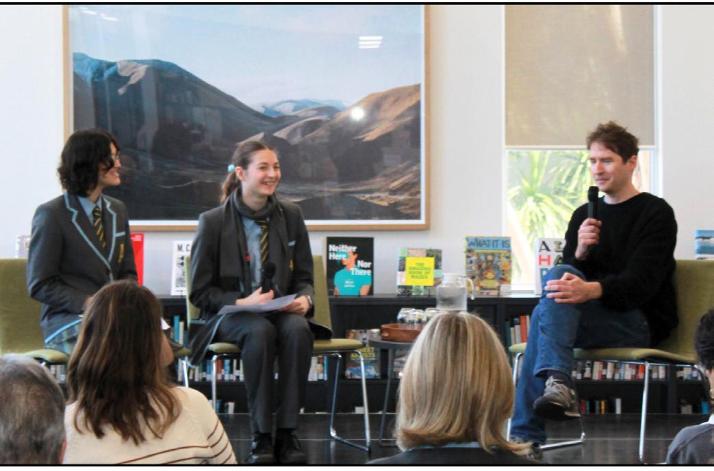 STUDENTS JULIETTE PHAM AND AMELIA SUMPTER CHAT TO POET CONNOR WEIGHTMAN (LEFT)