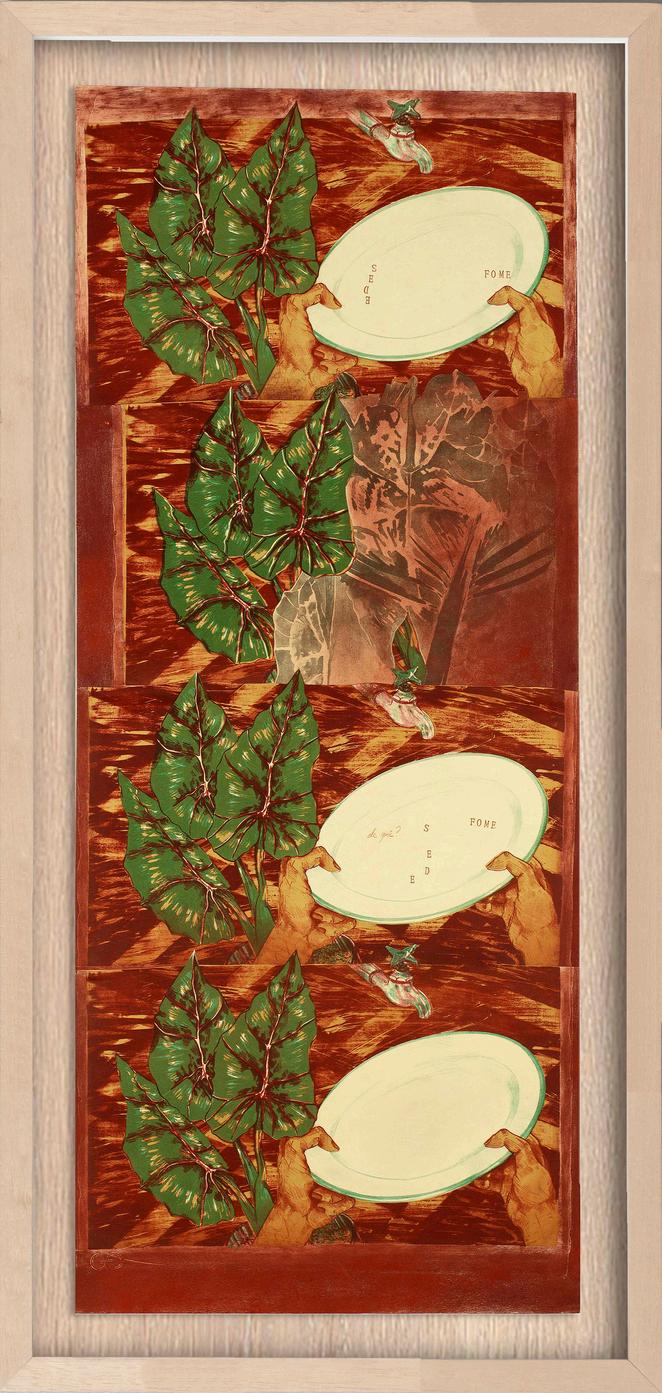 Liliane Dardot e Marcelo Silveira. em Oferenda. Pigmento sobre litografia e colagem. 161 x 73 cm. 1981/2025. Pigment on lithography and collage. 161 x