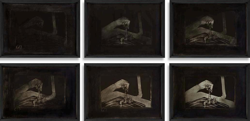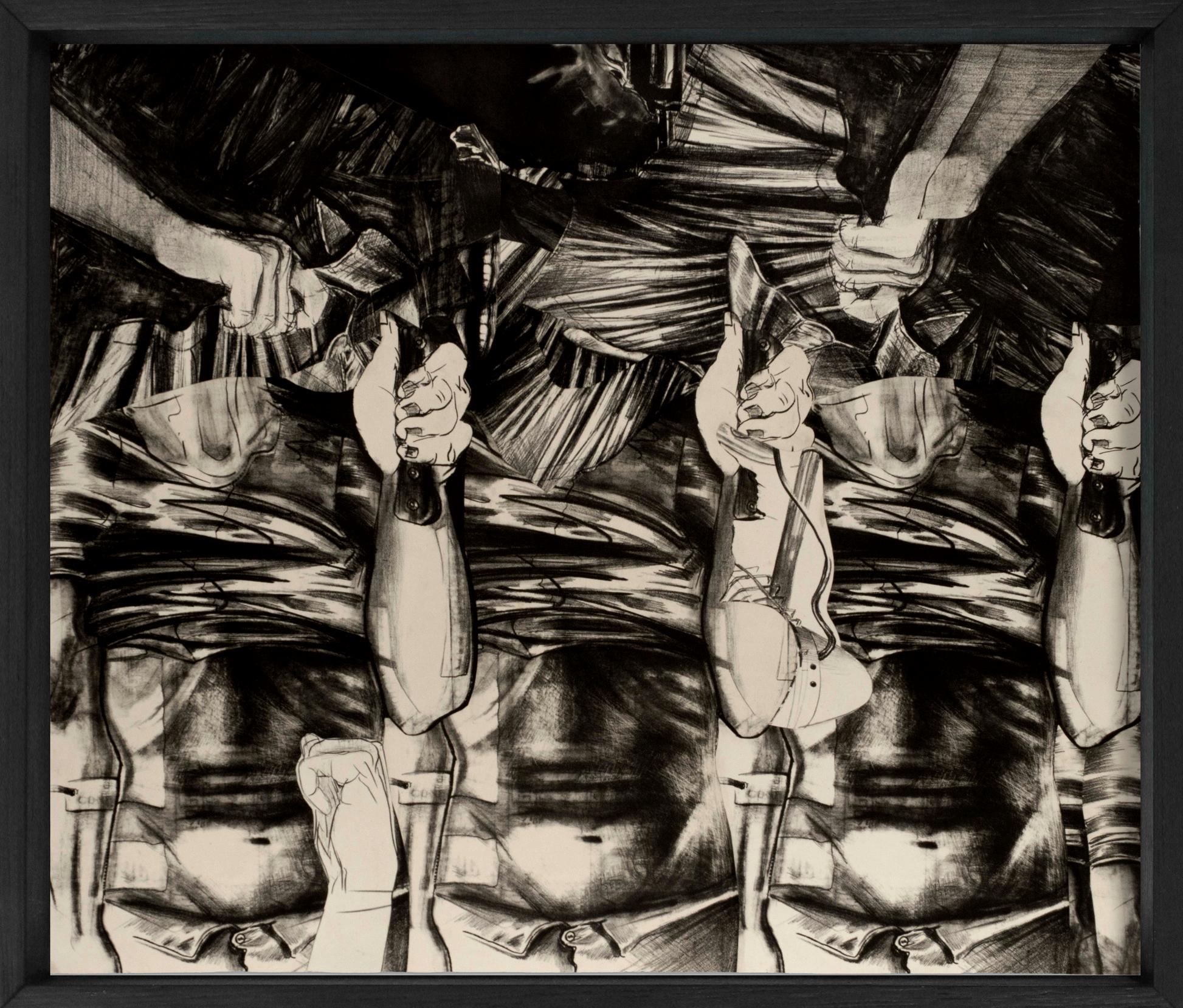 diferentes pedras (o que não deixa de ser um processo combinatório, como nas colagens obtidas com as atuais gravuras interferidas), ou, por fim, há também a possibilidade de se imprimir o “negativo” (isto é, a inversão dons tons de preto e branco), de modo que o desenho exista não menos como um índice – ou, se quisermos nos manter no vocabulário da gravura, mas mudando a conotação do termo, em várias matrizes – capaz de se reinventar continuamente, um elemento igualmente reconhecível nessas obras recentes, dado que as litografias se transformam em matrizes daquelas. A eventual repetição de uma mesma impressão, recortada e recombinada, estabelece uma outra abordagem sobre o dado serial, pois desloca-se da imagem existente como nascida para ser vista como reprodutível para outra que, usando a repetição como estrutura narrativa de uma obra única, cria uma nova dinâmica temporal nela (ou, quando a interferência não passa pelo recorte, mas pela inserção de cores, numa dualidade entre o reprodutível passar a conter em si também um caráter único de cada peça).