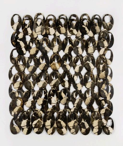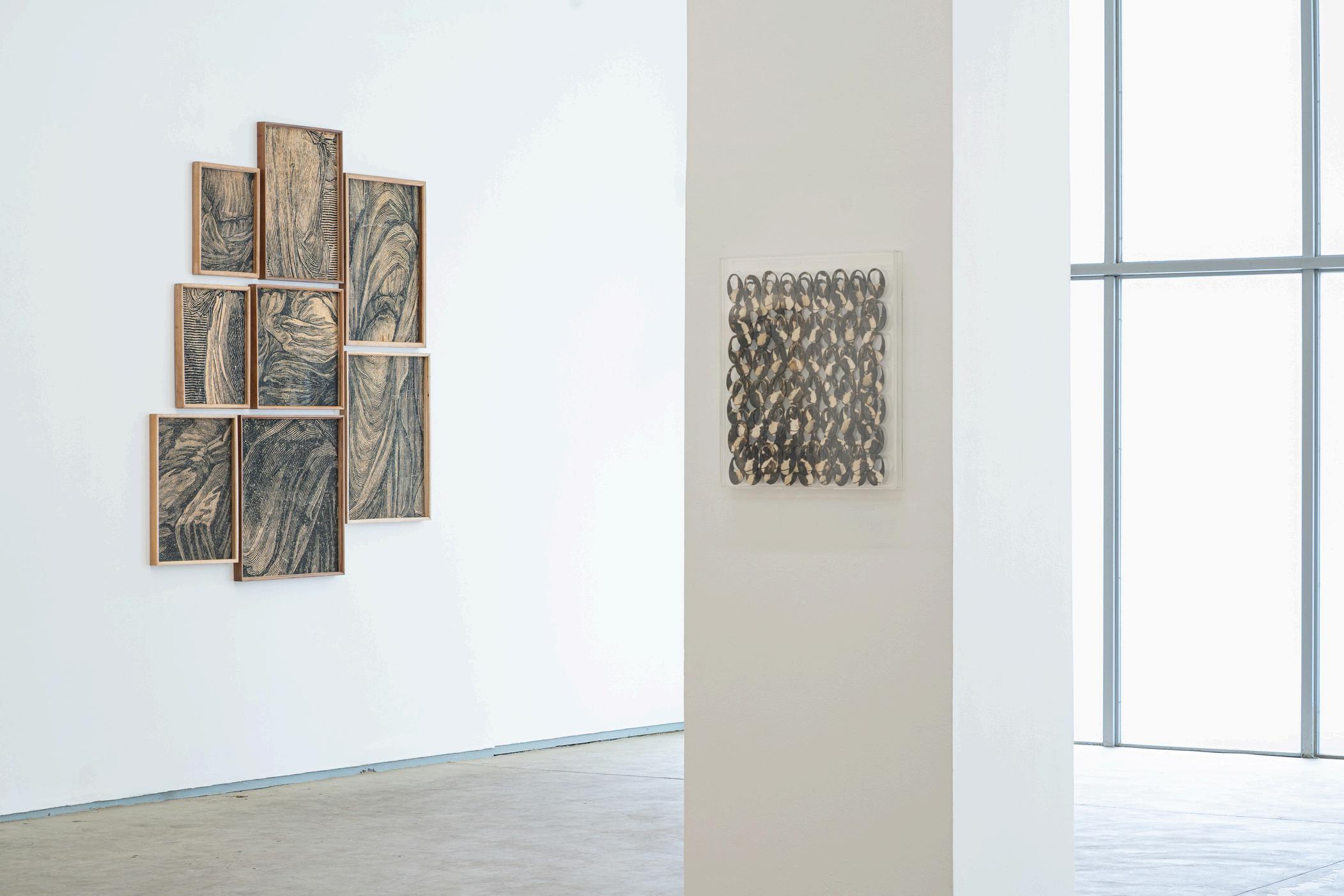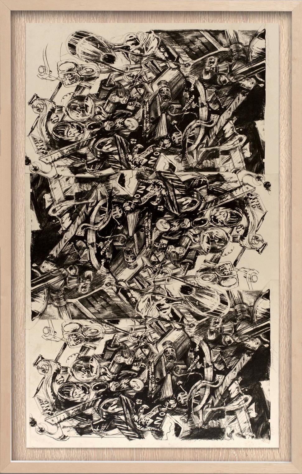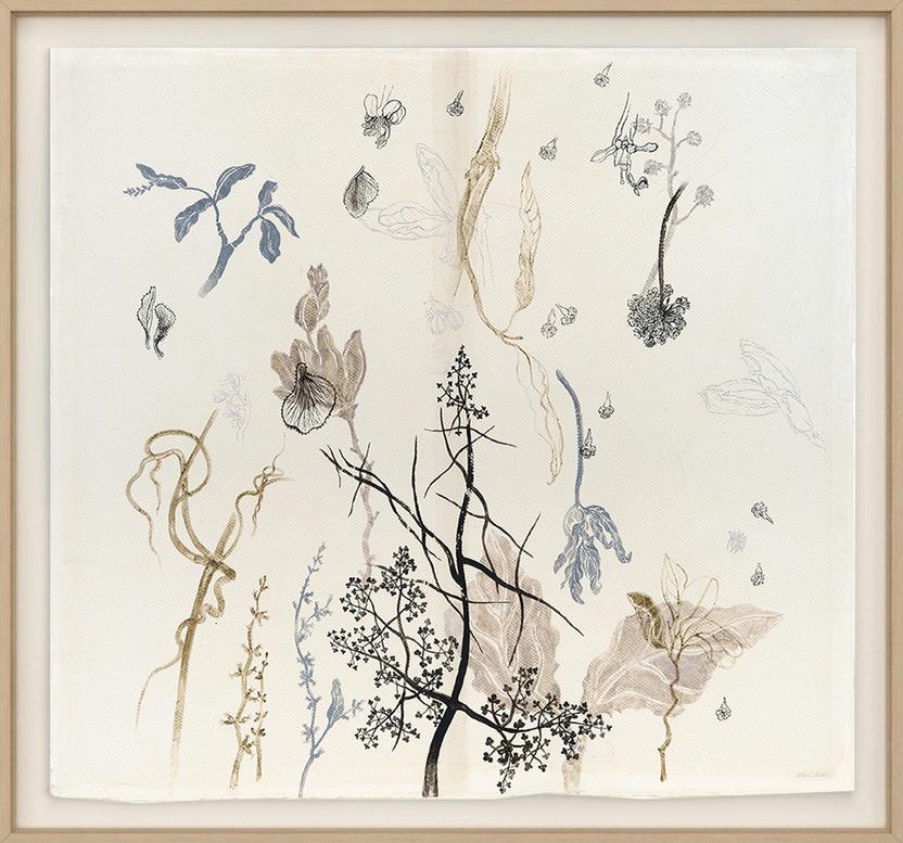 Desenhos sobrepostos e intercalados entre várias camadas de papel de seda sobre telinha de nylon, realizados com tinta à base de pigmentos e cinzas em médium acrílico. 134 x 144 cm. 2025.