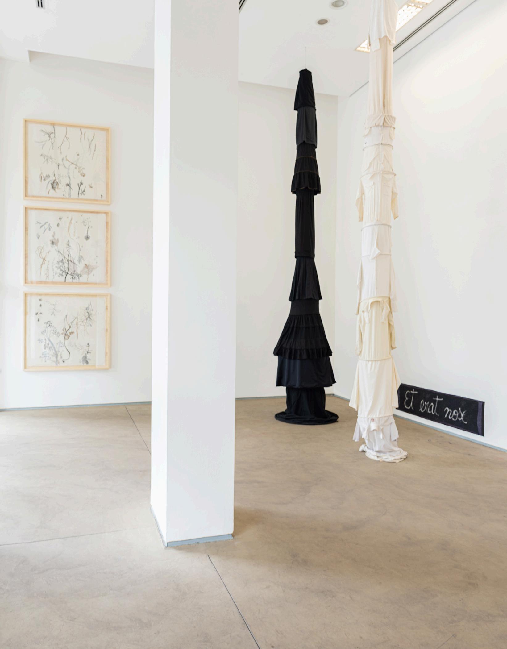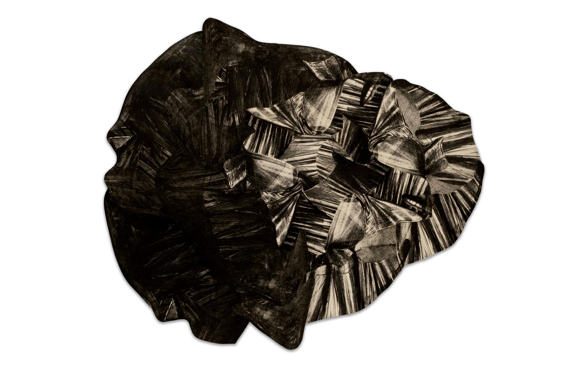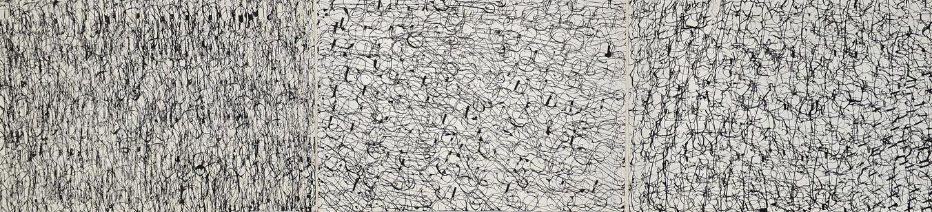 Overlapping and interspersed drawings between several layers of tissue paper on nylon mesh, made with pigment- and ash-based ink on acrylic medium. 134 x 144 cm. 2025.