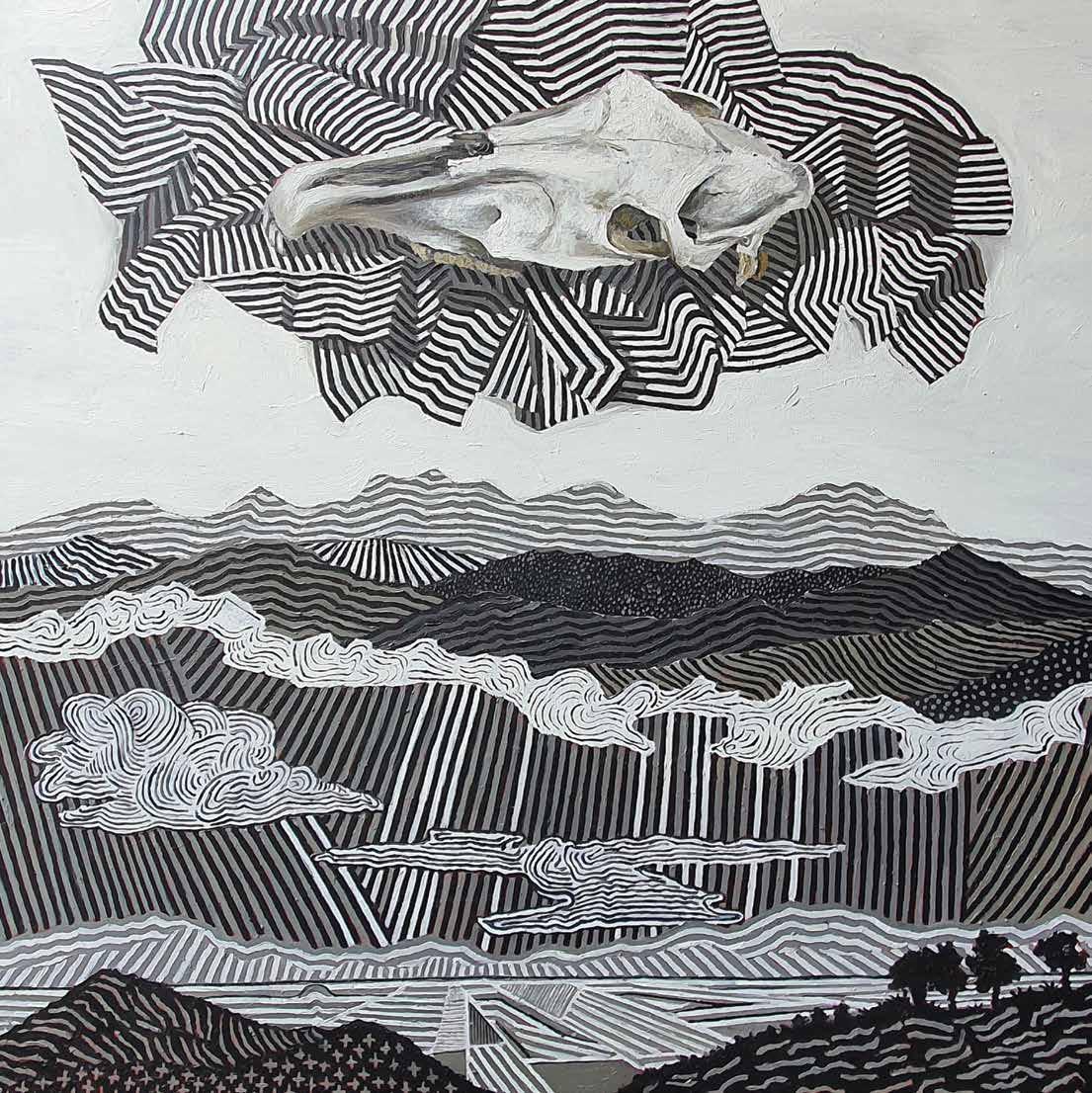 Argudín inicia con dos Topografías, la III y la IV, en las que ese tejido del que hablo lo es todo. En la primera de las piezas nos lleva a ver un cráneo vacuno montado en una nube; abajo, el horizonte en sus distintos planos se despliega: un perfil aserrado, extensiones desiertas, lomas y laderas. En la segunda pieza la cabeza de un hombre mira el mundo. Se trata de un rostro antiguo, una cabeza de hombre de cuello largo que viaja en una nube que desciende en Wirikuta. La antigüedad de ese rostro la acentúan los velos de su significado, de diálogo interno, las delimitaciones que marca el cuadro en cada uno de sus componentes significativos. El equilibrio del cuerpo de la cabeza del hombre que desciende lo da la nube que es su sombra, la alfombra mágica en la que viaja, bajando a la tierra. ¿Qué es lo que encuentra? me pregunto.