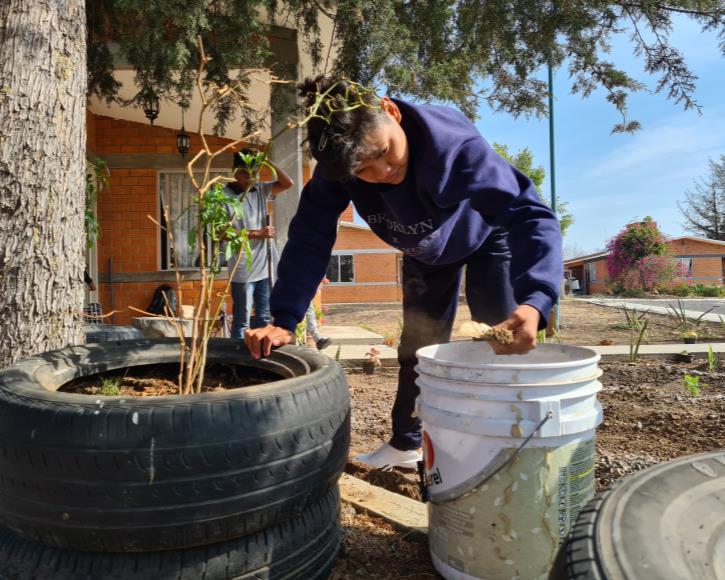 En la aldea, cada familia tiene un huerto en su jardín. Julián está al pendiente de lo que se necesite para conservarlo bien. Es una actividad que hacen en familia, lo que también les ayuda para que se sigan conociendo todos y para obtener sus propios alimentos.