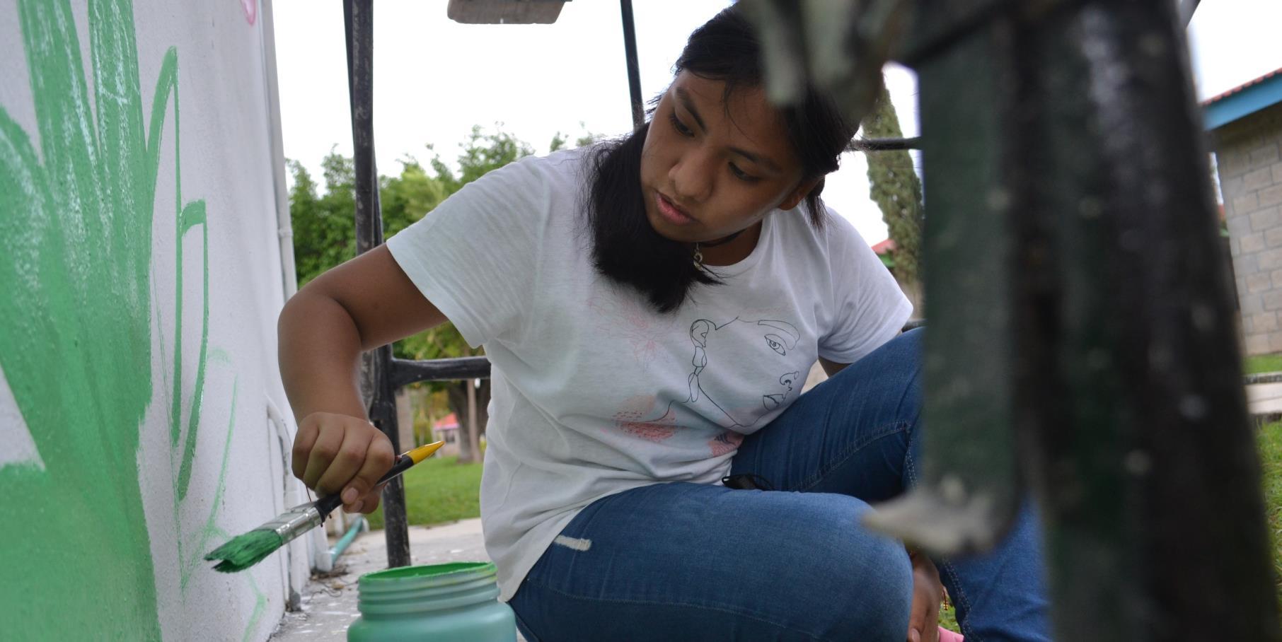 Mafer ayudó a pintar un mural en la Aldea como parte de la decoración para el Aniversario de la Aldea.