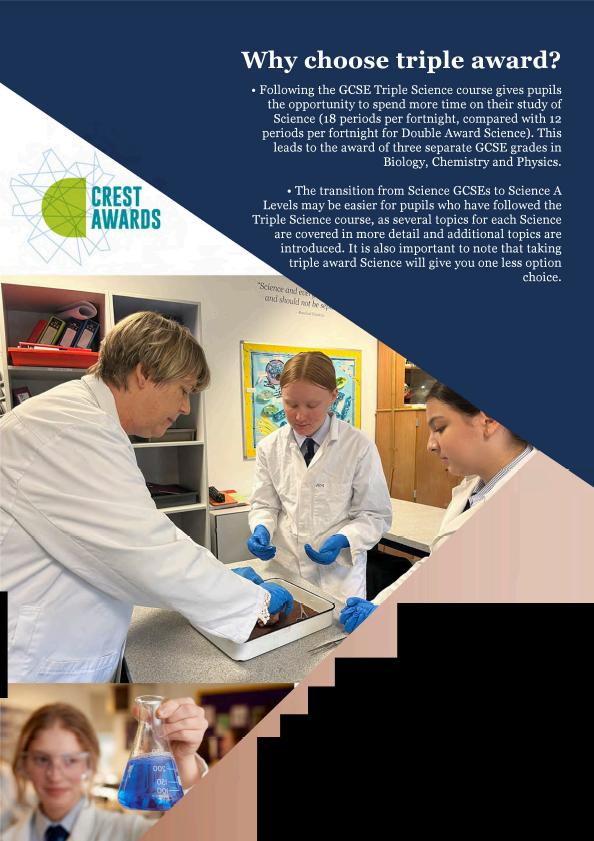 If you wish to study Triple Science, this should be one of your six choices. Occasionally, if you have an unusual combination of subjects or choose several subjects which only a few pupils study, we may place you in your sixth choice.