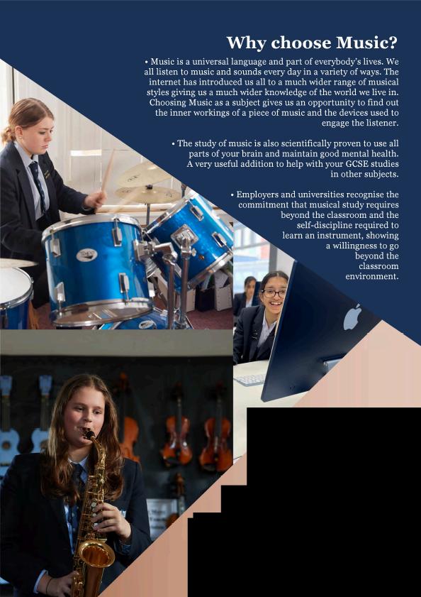 GCSE Music gives you the opportunity to develop your knowledge, understanding and skills of music building on what was learned at KS3 It gives you the skills to understand why music has different effects on you at different times, not only teaching you why you like certain styles of music but also why you don't like some pieces