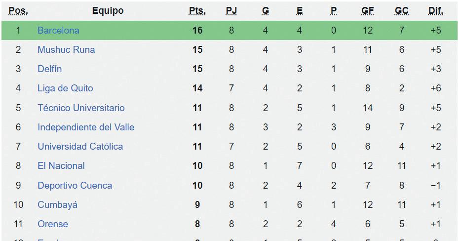 16 puntos, seguido de Mushuc Runa que tiene 15 unidades. Claro que este escenario fue posible gracias al empate en su propia casa del Ponchito ante Cumbayá. Pero no solo eso, pues el liderato de Barcelona también depende del partido de Liga de Quito ante Universidad Católica, que fue aplazado. Si Liga consigue un triunfo ante la Chatoleí, desplazará de la punta a Barcelona y los ligados serían los nuevos líderes de la tabla.