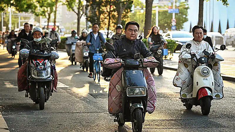 Decenas de deslumbrantes ciclomotores eléctricos están alineados afuera de un centro comercial en la ciudad de Hangzhou, en el este de China, atrayendo a los transeúntes a probarlos.