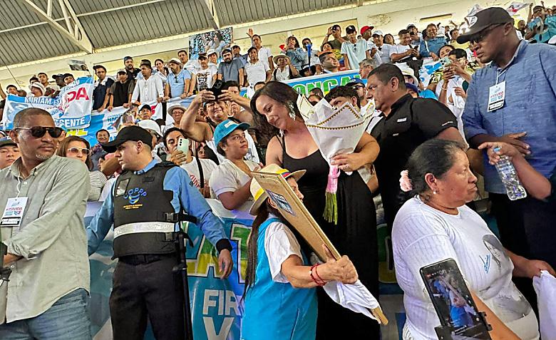 bleísta arribó al complejo deportivo, donde fue recibida por una multitud de aproximadamente 4,000 simpatizantes. Entre ramos de flores, afiches y constantes muestras de afecto, Rivadeneira caminó entre la militancia, deteniéndose a compartir gestos de cercanía y fotografías con los asistentes antes de subir a la tarima principal.