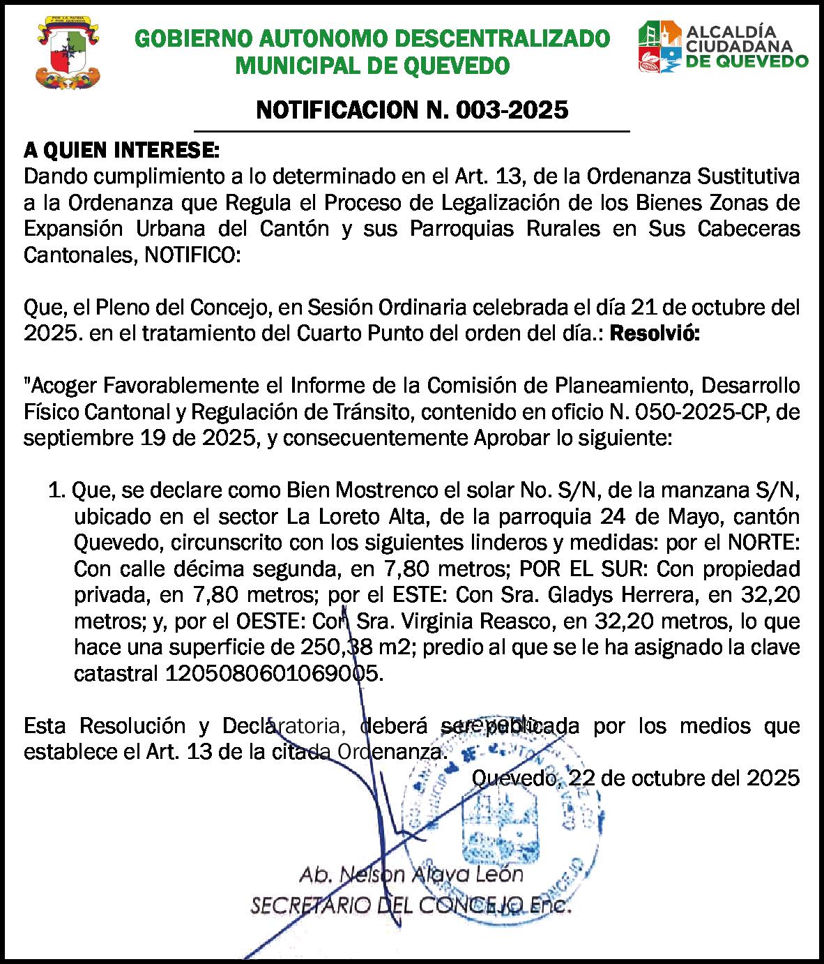 UNIDAD JUDICIAL DE FAMILIA, MUJER, NIÑEZ Y ADOLESCENCIA CON SEDE EN EL CANTÓN QUEVEDO VISTOS.- Ab. VANESSA VINUEZA GRANDA. Avoco conocimiento en mi calidad de Jueza de la Unidad Judicial Primera de Familia, Mujer, Niñez y Adolescencia del cantón Quevedo, Provincia de los Ríos, designada mediante resolución del Pleno del Consejo de la Judicatura No. 138-2015, de fecha 20 de mayo del 2015. Dentro del presente juicio de PARTICIÓN DE BIENES SUCESORIOS N.- 12203- 2024-01238, que siguen JORGE ADALBERTO ZAMORA CHAVEZ, MERYNE IDALIA ZAMORA CHAVEZ, EMPERATRIZ GEOVANNY ZAMORA CHAVEZ, MARISOL GEORGINA ZAMORA CHAVEZ, SORAYA ISOLINA ZAMORA CHAVEZ y LEIBA JESABEL ZAMORA BONE (en calidad de herederos), en contra de los herederos conocidos WILMAN GEORGE ZAMORA CHAVEZ, JORGE ADALBERTO ZAMORA CHAVEZ, RICARDO FELICIANO ZAMORA CHAVEZ, ESMIGER LIZBETH ZAMORA HAIMAN, EDISON LORETO ZAMORA HAIMAN, CLETA DEL ROCIO ZAMORA HAIMAN e IVAN ALFREDO ZAMORA HAIMAN, y de los herederos desconocidos de quien en vida fue RICARDO FELICIANO ZAMORA GALBOA y ALFREDO CELEDONIO ZAMORA CHAVEZ. . La demanda es clara y reúne los requisitos legales establecidos en el Art. 142 y 143 del Código Orgánico General de Procesos: PRIMERO: Se admite al trámite respectivo bajo el procedimiento SUMARIO conforme prescribe el Art. 332 y siguientes del Código Orgánico General de Procesos;TERCERO:QUINTO; Cítese a los herederos desconocidos de los causantes que en vida se llamaron RICARDO FELICIANO ZAMORA GALBOA y ALFREDO CELEDONIO ZAMORA CHAVEZ, por medio de prensa escrita, de conformidad con lo dispuesto en el Art. 56 numeral 1, en concordancia con el Art. 58 del Código Orgánico General de Procesos, por lo que se dispone que la Secretaria de la Unidad confiera el extracto correspondiente y se publique en uno de los Diarios de mayor circulación que se editan en esta localidad, publicación que se hará con letra tipo helvática, con tamaño de fuente No. 8 y a doble columna, previo a realizarse el extracto de la publicación que la parte accionante realice la declaración de que es imposible determinar la individualidad, el domicilio o residencia de los herederos presuntos y desconocidos, para lo cual deberán comparecer a esta Unidad Judicial en cualquier día y hora hábil; Lo que comunico a ustedes para los fines legales consiguientes, advirtiéndoles la obligación que tienen de señalar casillero judicial electrónico para las notificaciones correspondientes, caso contrario serán declarados en rebeldía. Quevedo, 17 de octubre del 2025