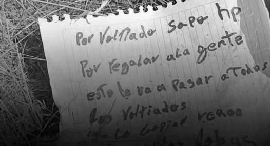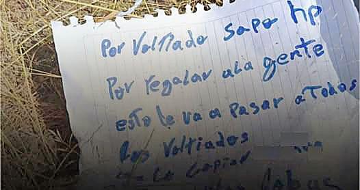 El texto, escrito con tinta azul, comenzaba con la frase “por volteado” y continuaba con una amenaza directa: “Eso les pasa a las personas que estén regalando gente”. Esta frase ha sido interpretada por las autoridades como una clara advertencia relacionada con posibles actos de traición entre bandas criminales que operan en la zona.