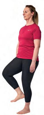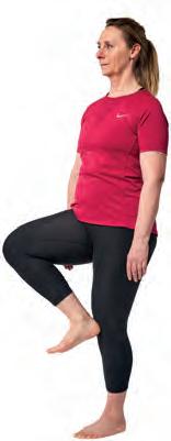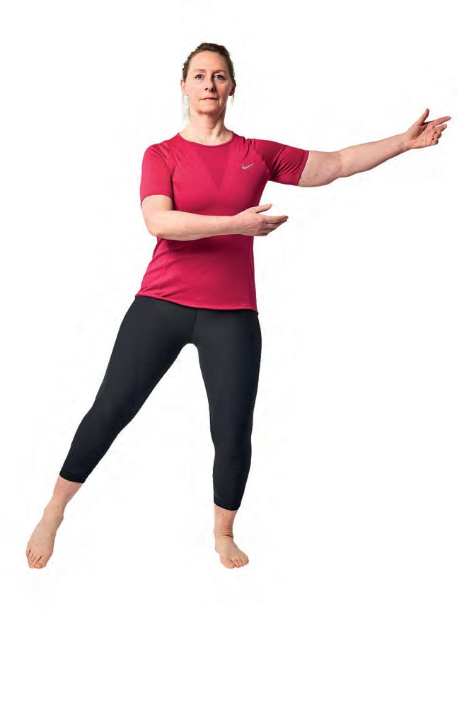 Stå på højre ben og løft højre arm op over hovedet. Samtidig løftes venstre ben bagud og op. Hold balancen, og vend tilbage til stående stilling.