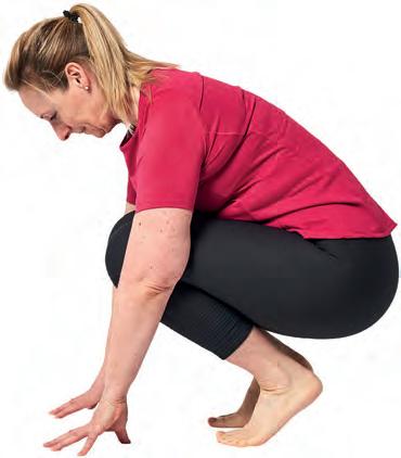 Stående med hoftebreddes afstand mellem fødderne. Sæt dig ned i hugsiddende med fingerspidserne støttende i gulvet. Løft hælene fri af gulvet.
