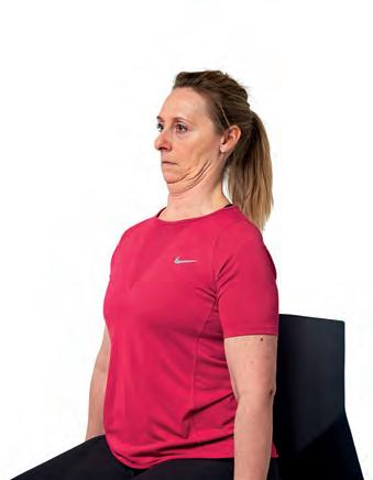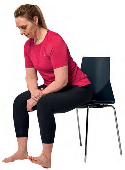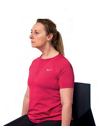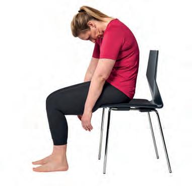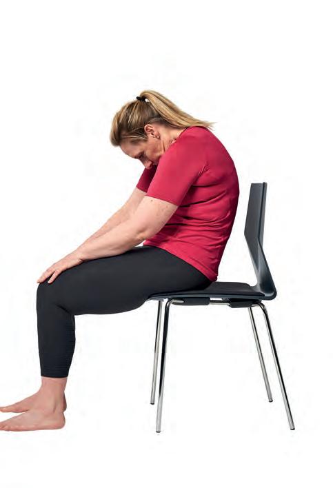 Sid fremme på stolen. Sænk hagen til brystet og mærk et let stræk i nakken, ned mod skulderbladene. Rul hovedet op på plads hvirvel for hvirvel. Armene er afslappede under hele øvelsen.