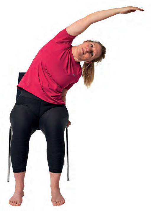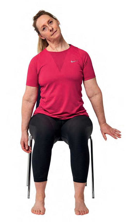 Sid fremme eller tilbage på stolen. Læg højre øre mod højre skulder – samtidig med at venstre arm forlænges mod gulvet. Hovedet føres op på plads og venstre arm afspændes. Gentag til modsat side.