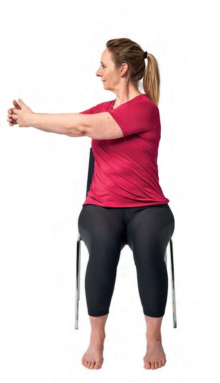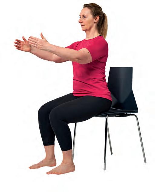 Sid fremme på stolen. ”Hold om kurven”. Løft armene op, så fingerspidserne rører let hinanden i højde med brystbenet. (Forestil dig du holder om en kurv).
