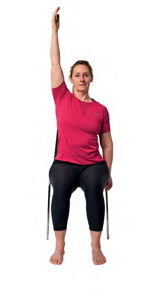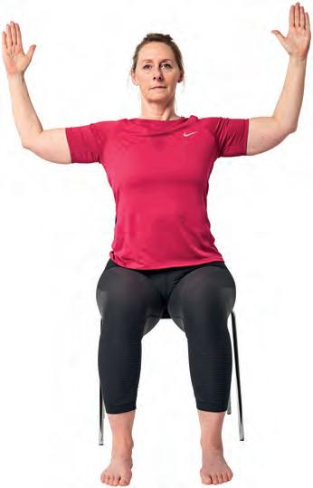 Sid fremme på stolen. Løft armene op over hovedet med let bøjede albuer.