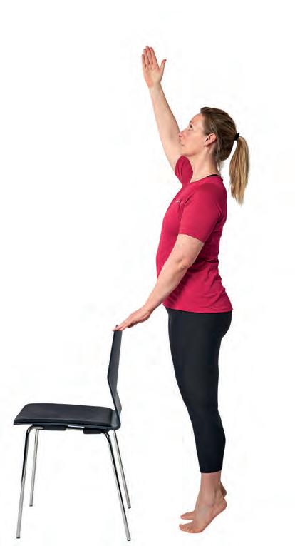 Løft op på tå samtidig med at den ene arm strækkes op over hovedet. Evt. med let støtte til stol med modsat hånd.