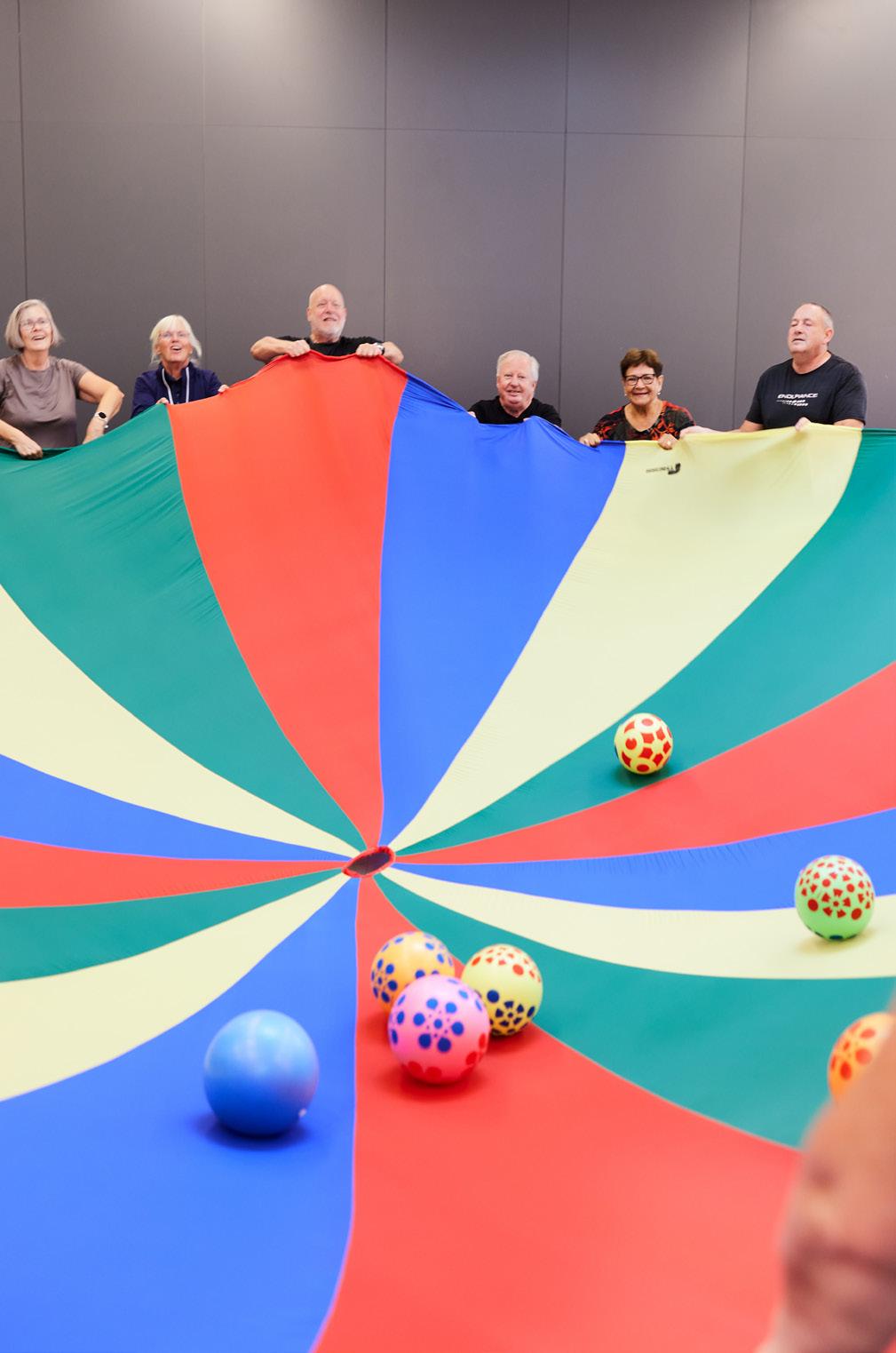 • Øvelsen kan udføres siddende på stole. Lav siddende gang med benene, mens faldskærmen bevæges op og ned.