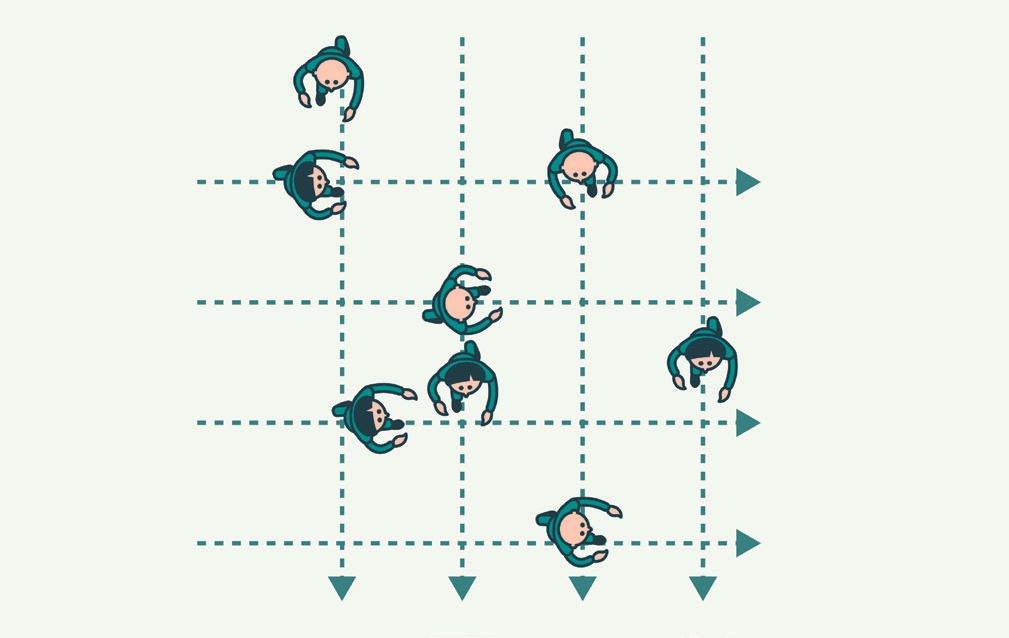 • Deltagerne kan også selv styre deres retningsskift ved at tælle skridt. Start fx med 16 skridt og sæt det gradvist ned til 12, 8 og 4.