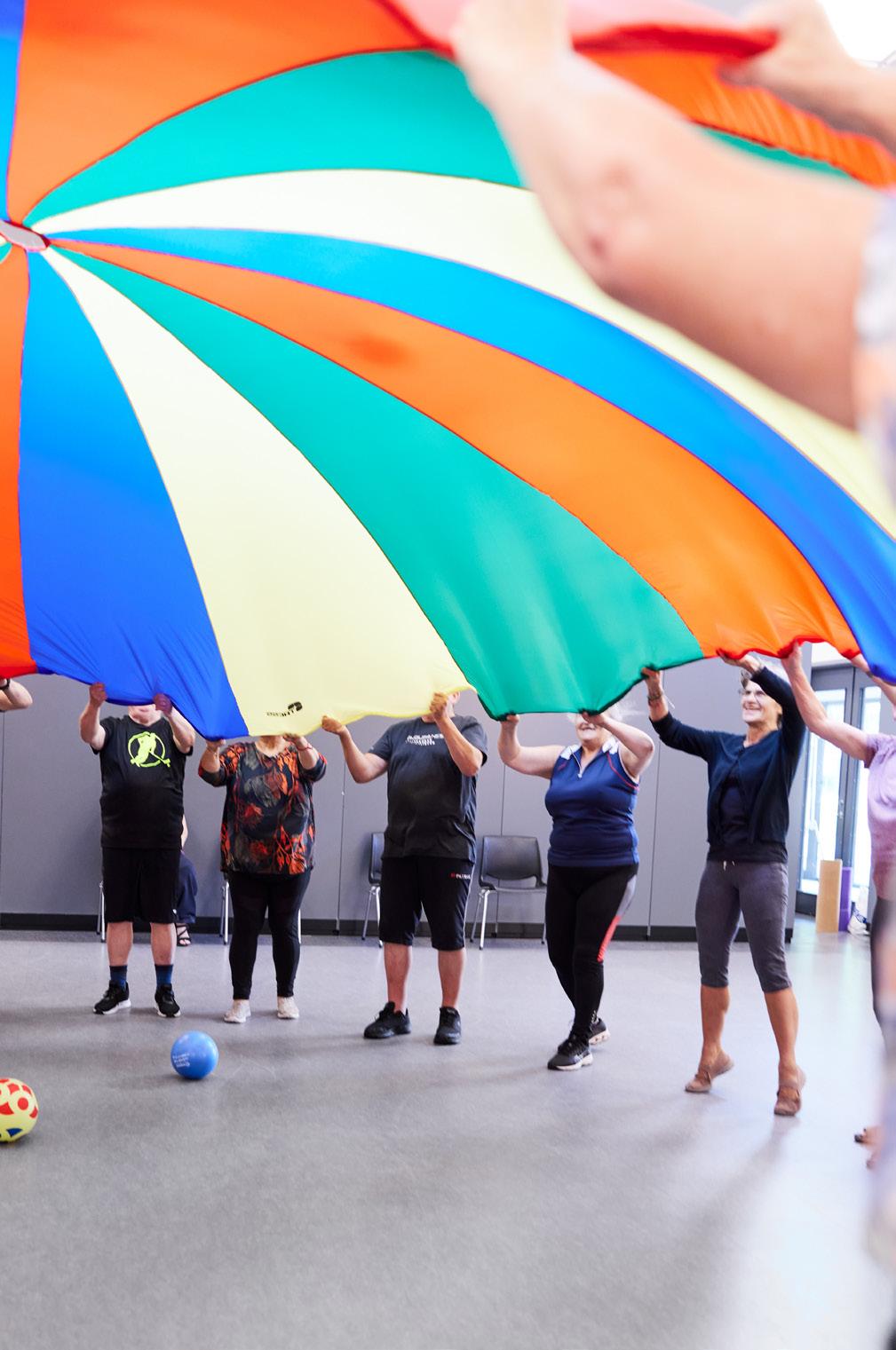 • Gå eller løb rundt, mens deltagerne holder fast i faldskærmen. Stop op fx på omkvædet i musikken og lav store bevægelser med faldskærmen op og ned – gerne helt ned til knæene, hvis deltagerne er tilstrækkeligt smidige.