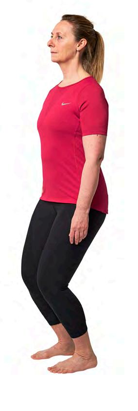 Vær opmærksom på at knæene peger lige ud over tæerne. Armene kan holdes afslappede ned langs siden af kroppen. Gentag øvelsen med venstre ben forrest.