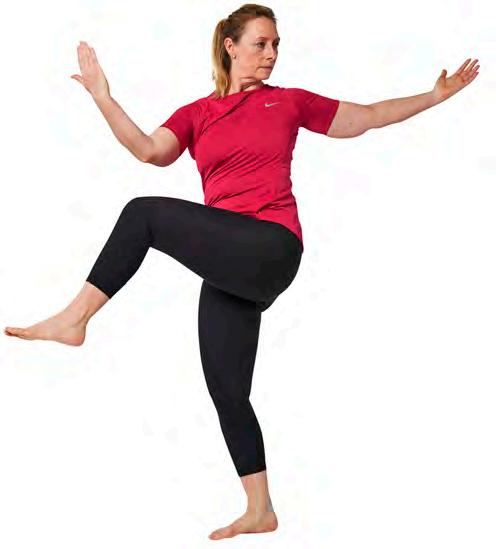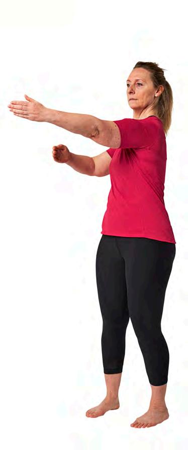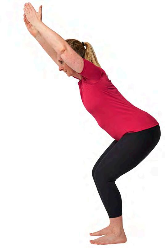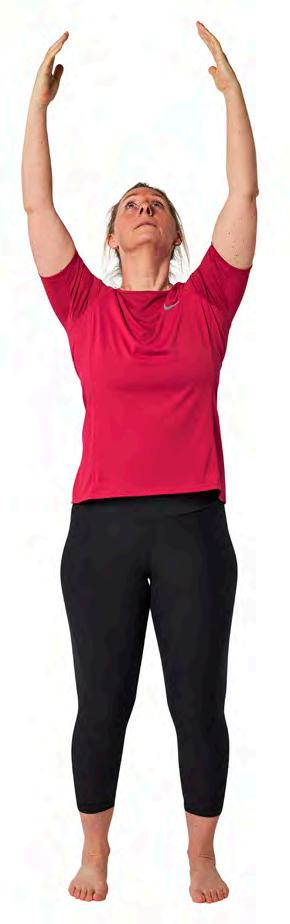 fingrene. Løft armene op og frem over hovedet og kom samtidigt op på tå. Idet armene løftes er der lidt mere end skulderbreddes afstand mellem hænderne.