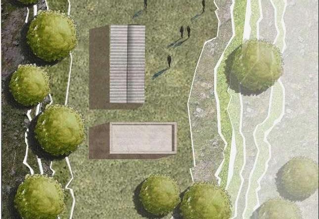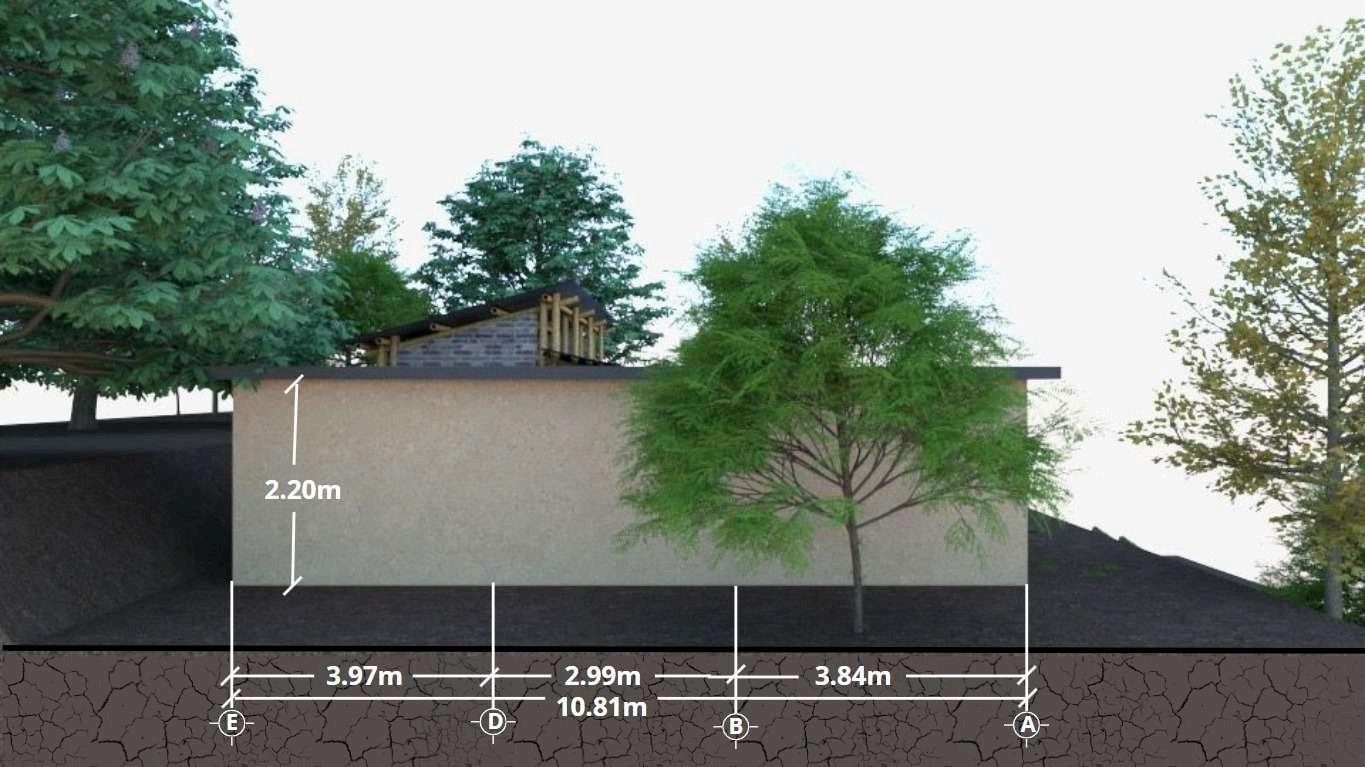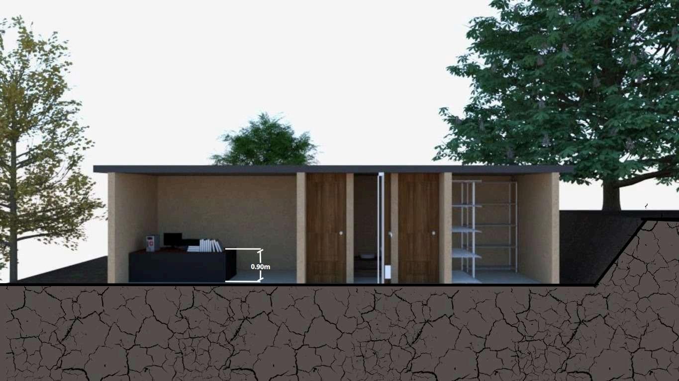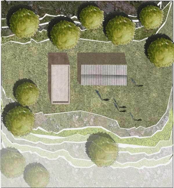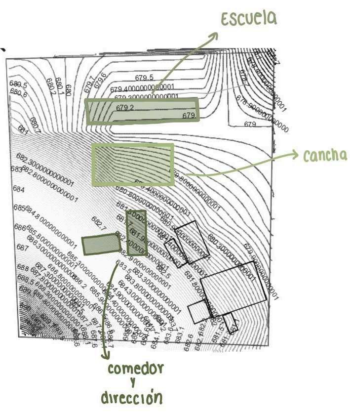 Se puede observar los distintos niveles topogr谩ficos, la barrera natural para controlar el agua pluvial y la dimensi贸n de los vol煤menes en vista a茅rea