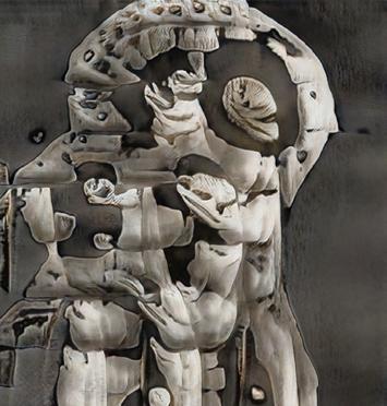 Using StyleGan AI trainings, we compiled images of objects with formal properties we wanted to iterate upon. Assemblages of corals and statues were mixed with the tectonic properties of machinery and camera cross sections, resulting in a spatial idea with separate pieces but a clear organizational logic and structural idea.